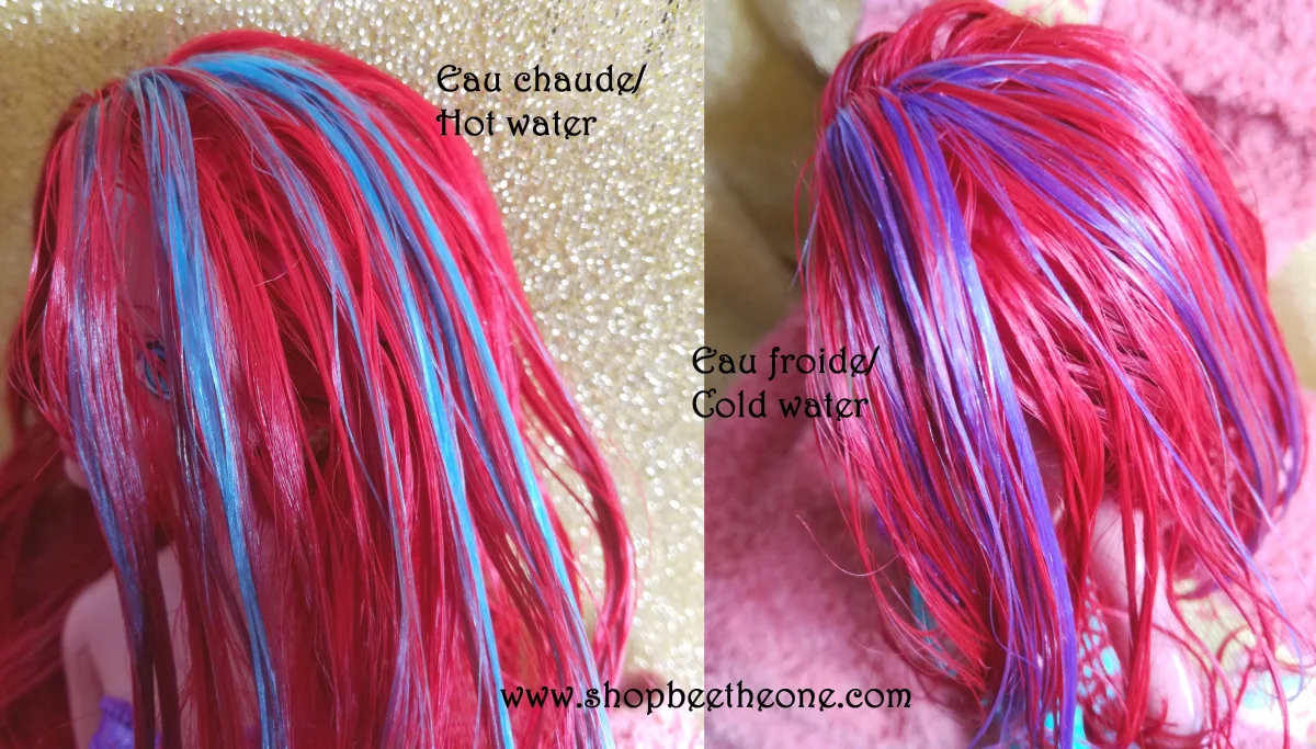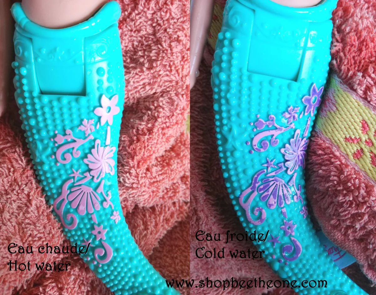 La poupée a une fonction de changement de couleur au contact de l’eau. Avec l’eau chaude, les fleurs sur sa nageoire deviennent rose clair et une mèche de ses cheveux devient bleu clair. Avec l’eau froide, les fleurs redeviennent rose et violet et la mèche des cheveux redevient violette.