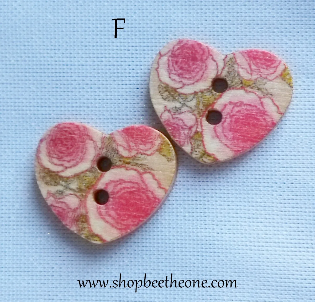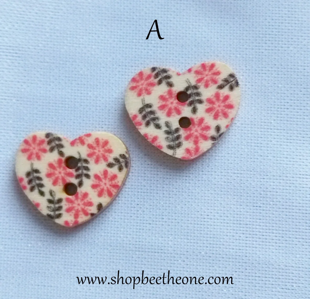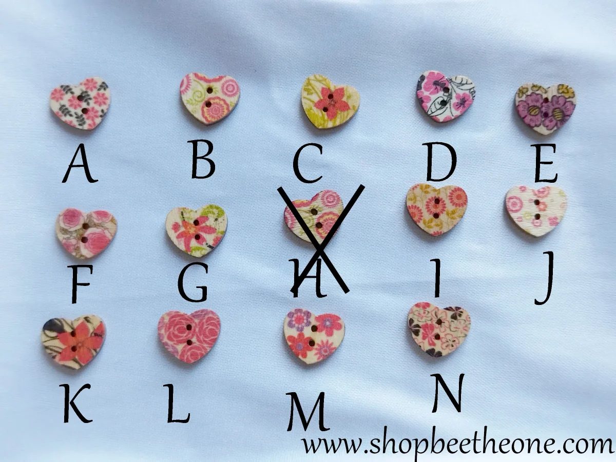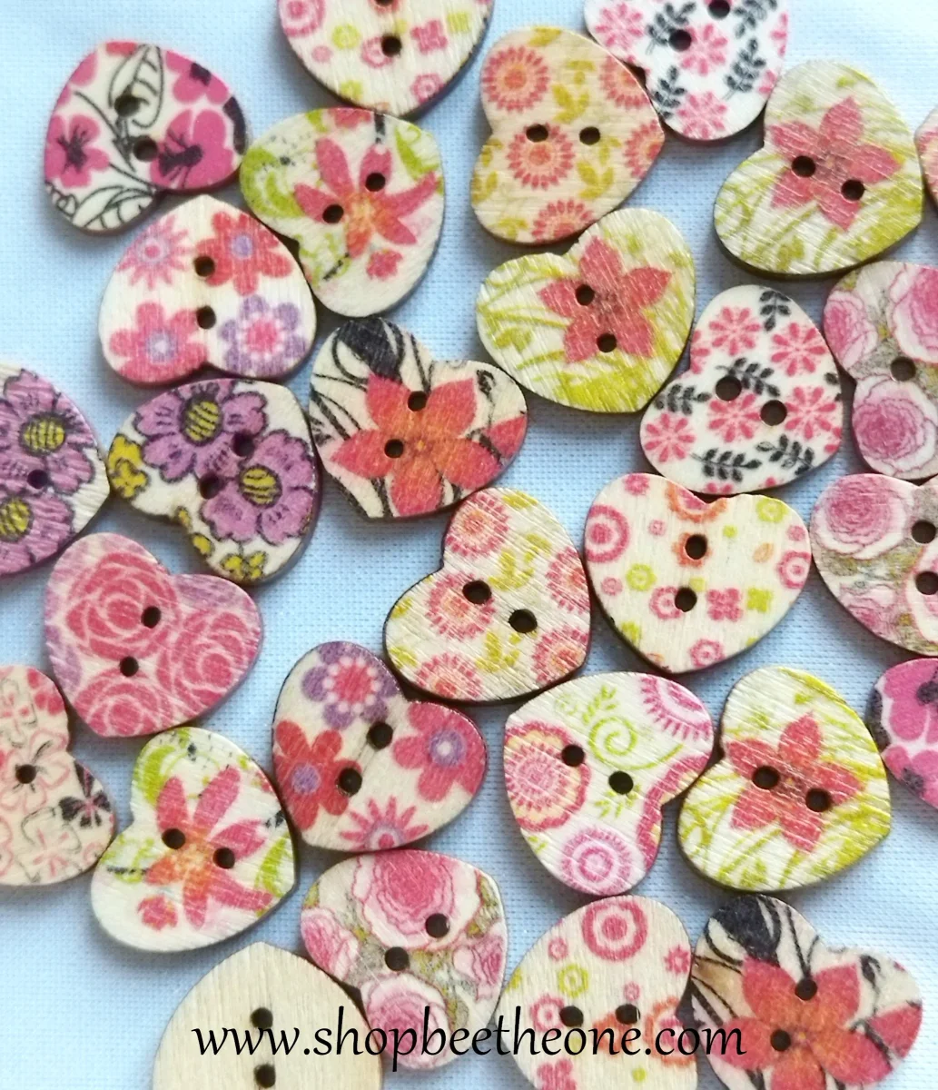 Un joli bouton en forme de petit coeur, avec un motif de fleurs roses ou rouges, accompagnées ou non de feuilles