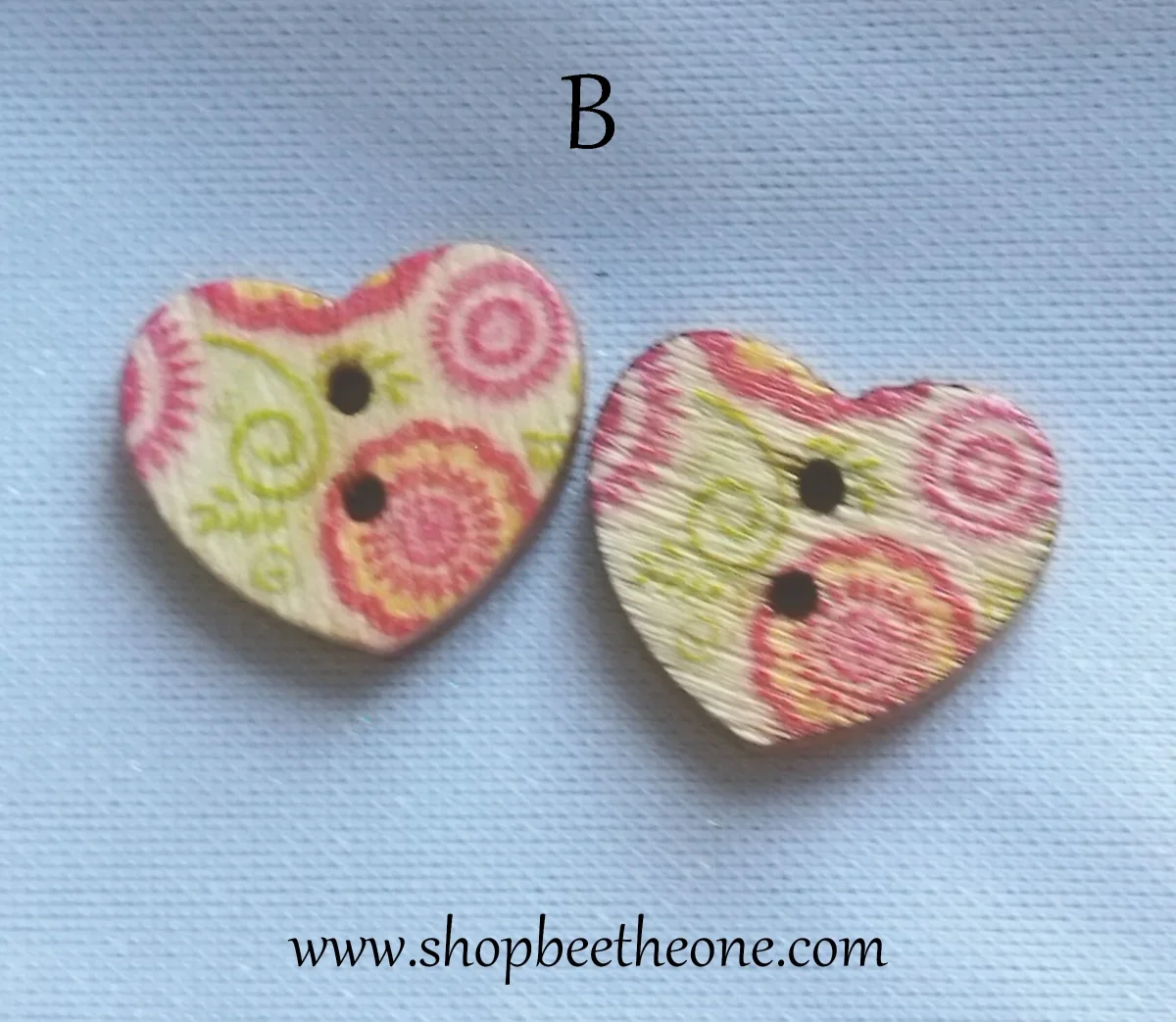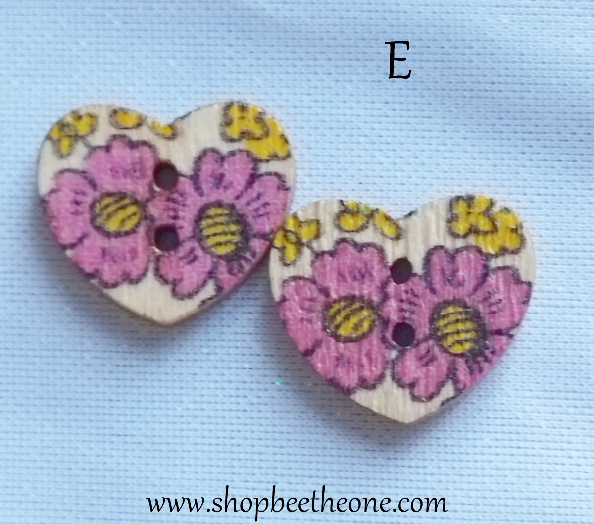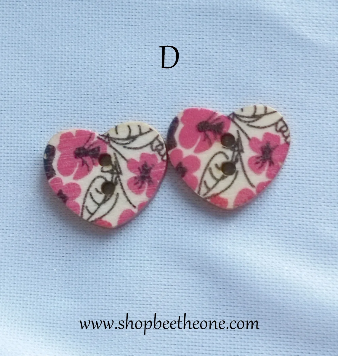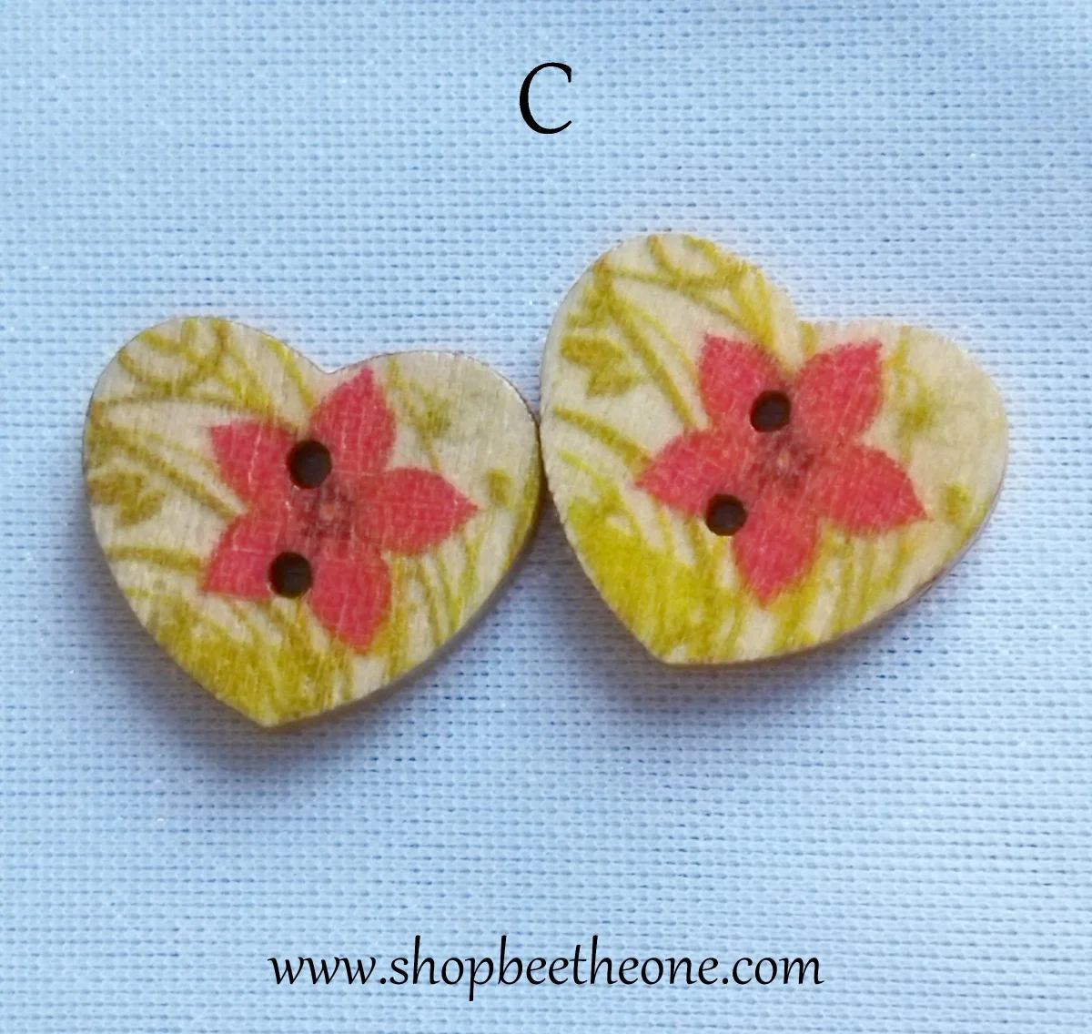 Un joli bouton en forme de petit coeur, avec un motif de fleurs roses ou rouges, accompagnées ou non de feuilles