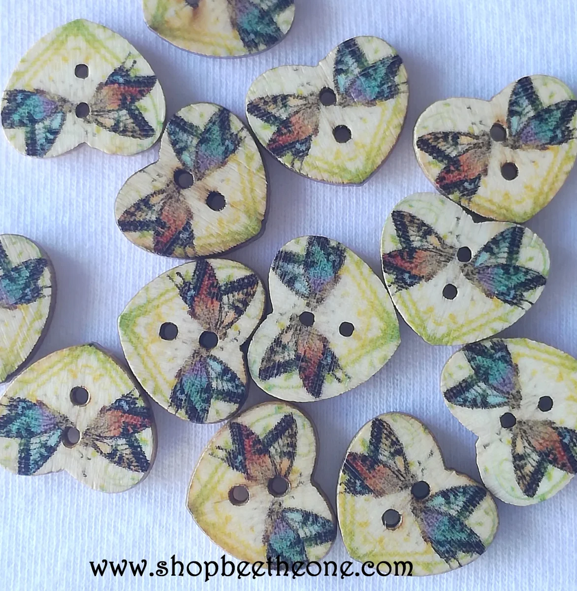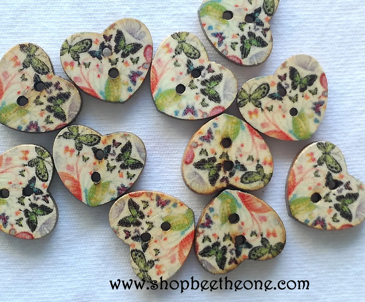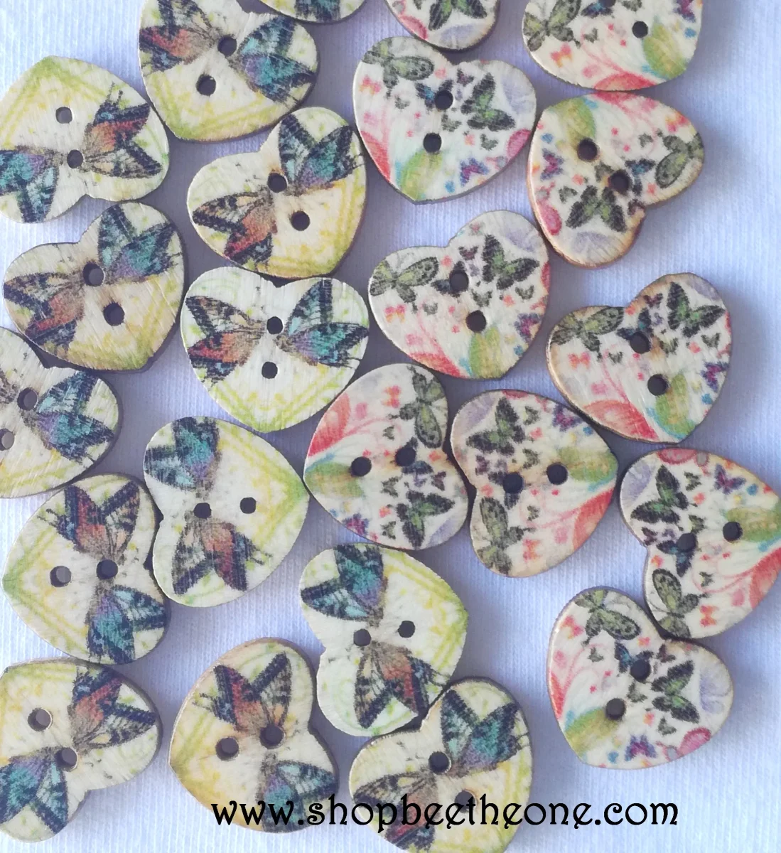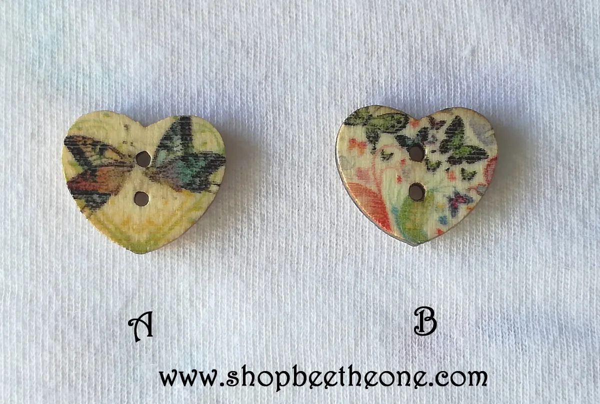 Un joli bouton en forme de petit coeur, avec un motif de papillons sur fond fleuri