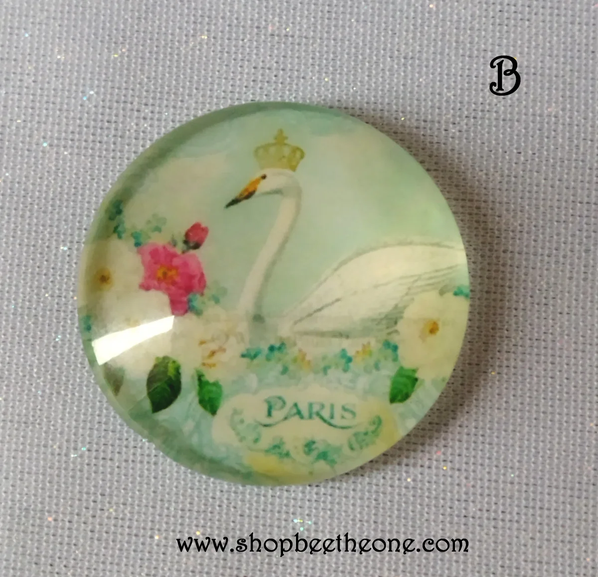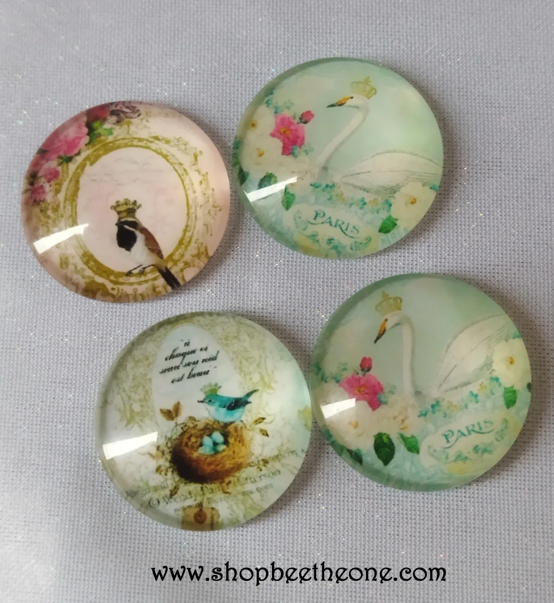 De superbes cabochons effet loupe, ronds et bombés, en verre, à coller. Avec de magnifiques illustrations d’oiseaux portant des couronnes, inspirées de l’élégance à la française