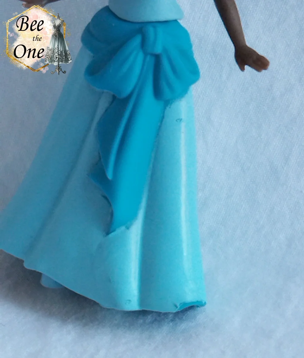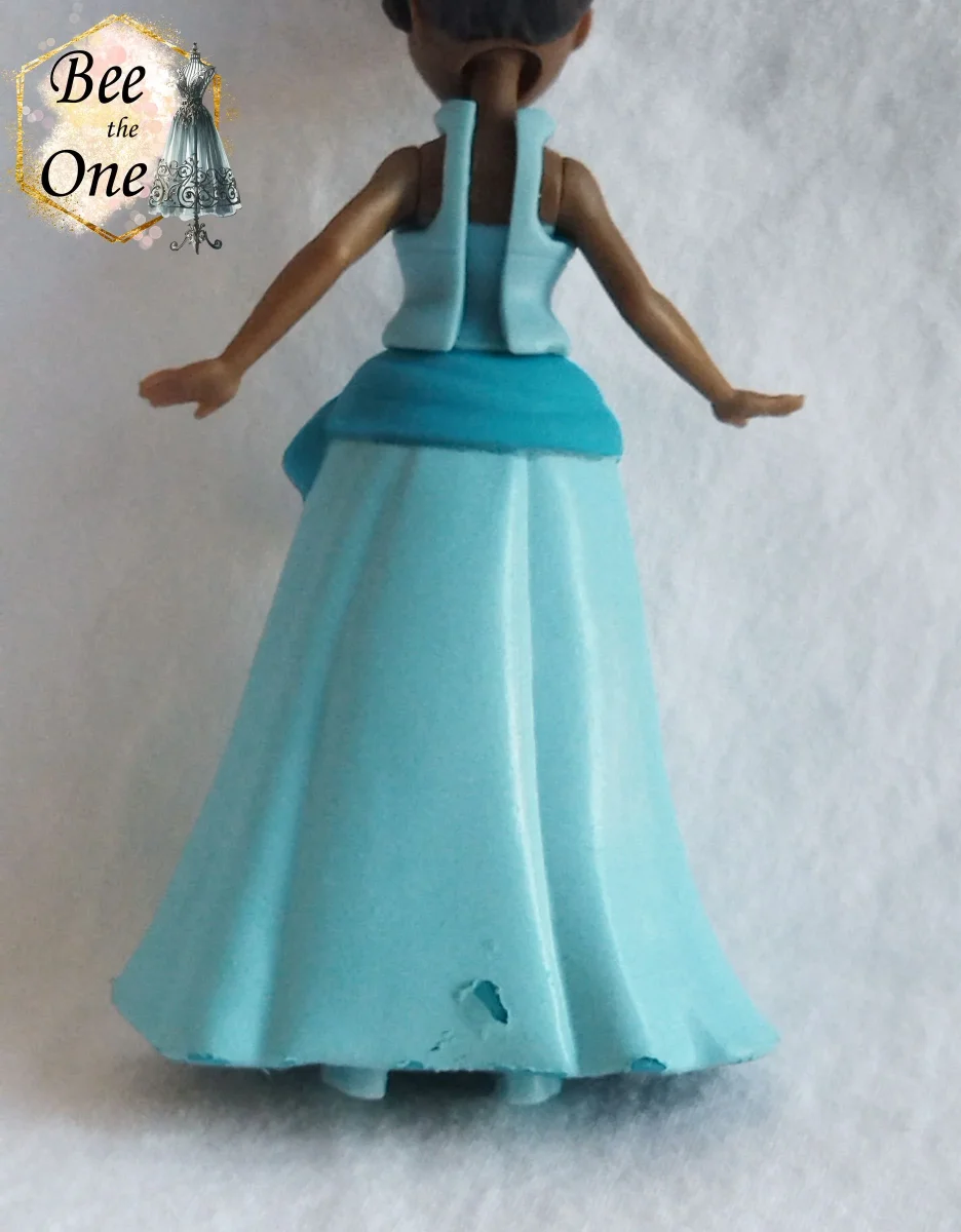 La jupe est en plastique souple bleu foncé recouvert d’une couche d’apprêt bleu clair. Mais la couche bleu clair est abimée à certains endroits, notamment au bas de la jupe et dans le dos