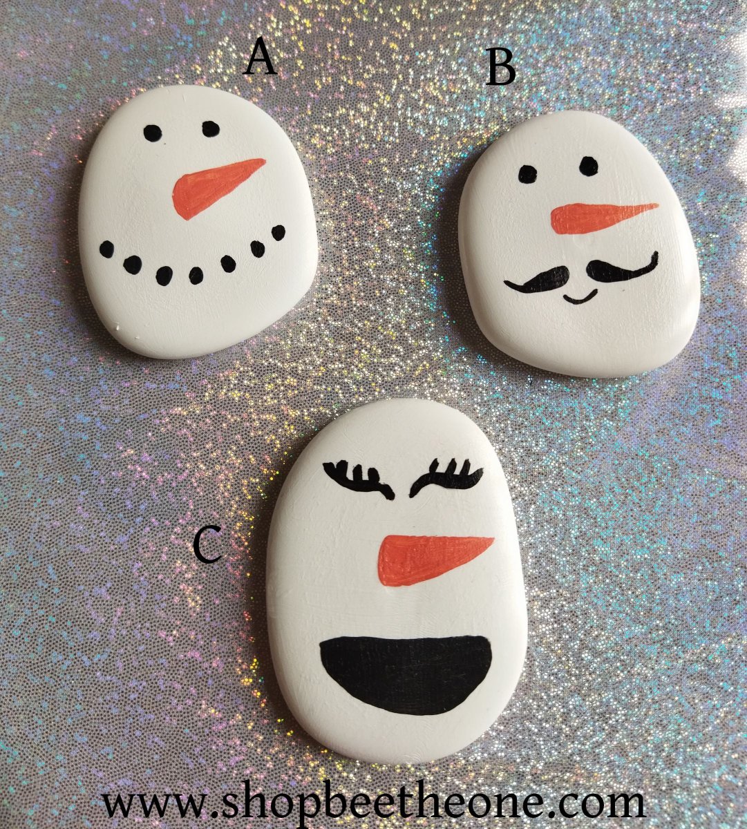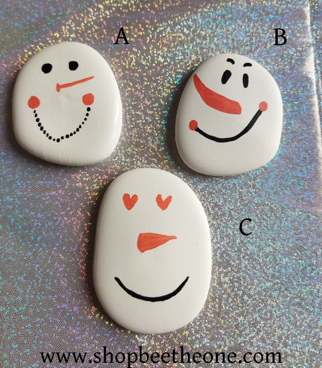 Les galets « Bonhomme de neige » se déclinent en trois modèles. Chaque modèle a un visage de bonhomme de neige différent sur chaque côté