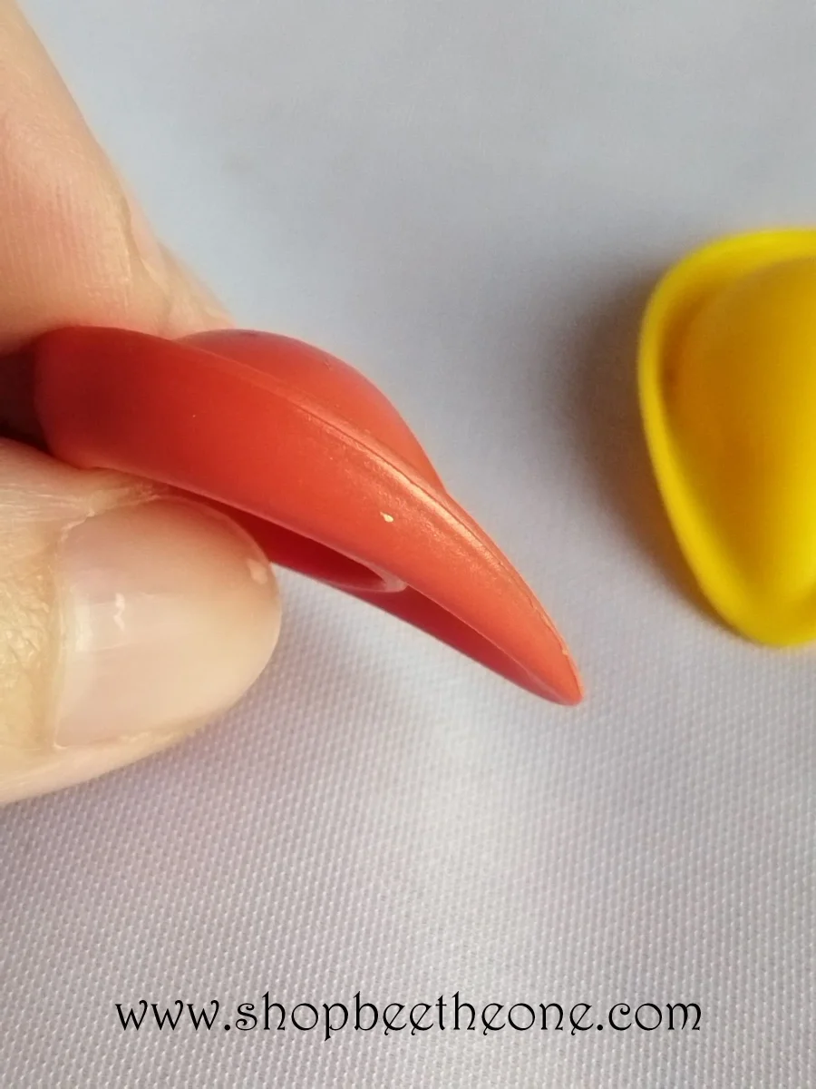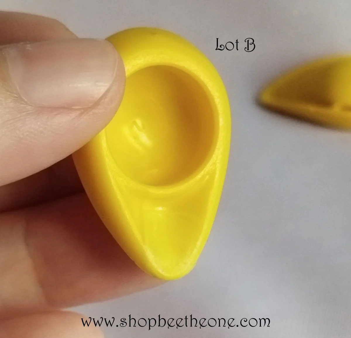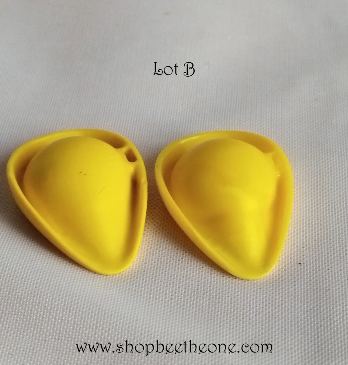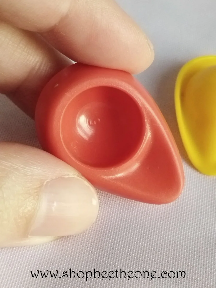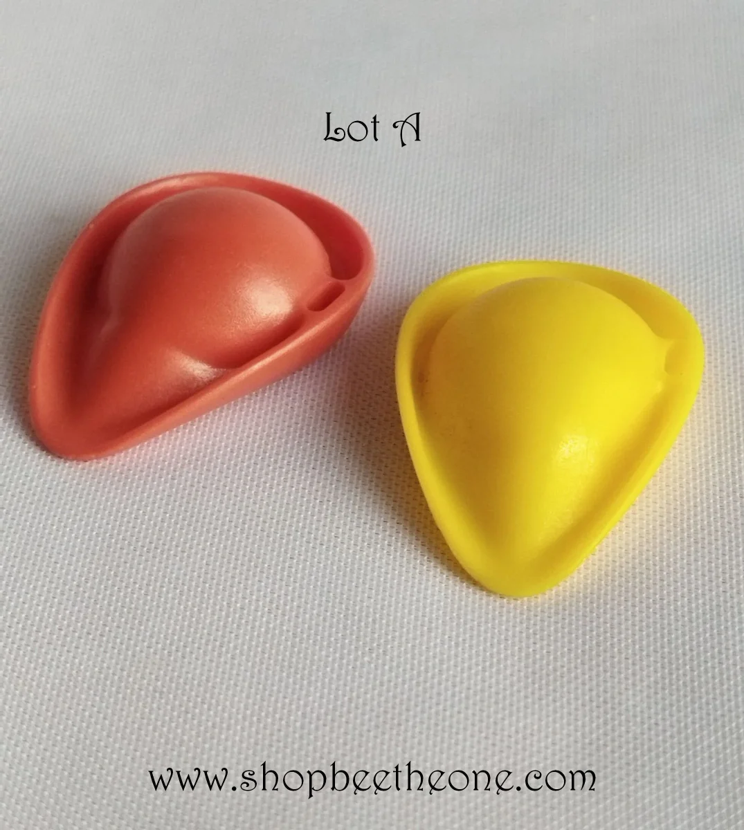 Le lot A est composé d’un chapeau rouge et d’une chapeau jaune. Le lot est propre et en bon état. Le chapeau rouge est en très bon état. Il a seulement un petit point blanc sur le côté. Le chapeau jaune a une petite trace sombre sur le côté et une légère ombre dans le plastique de l’autre côté, très peu visible même à l’oeil nu