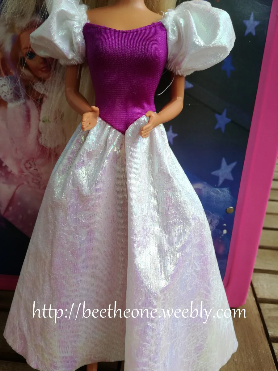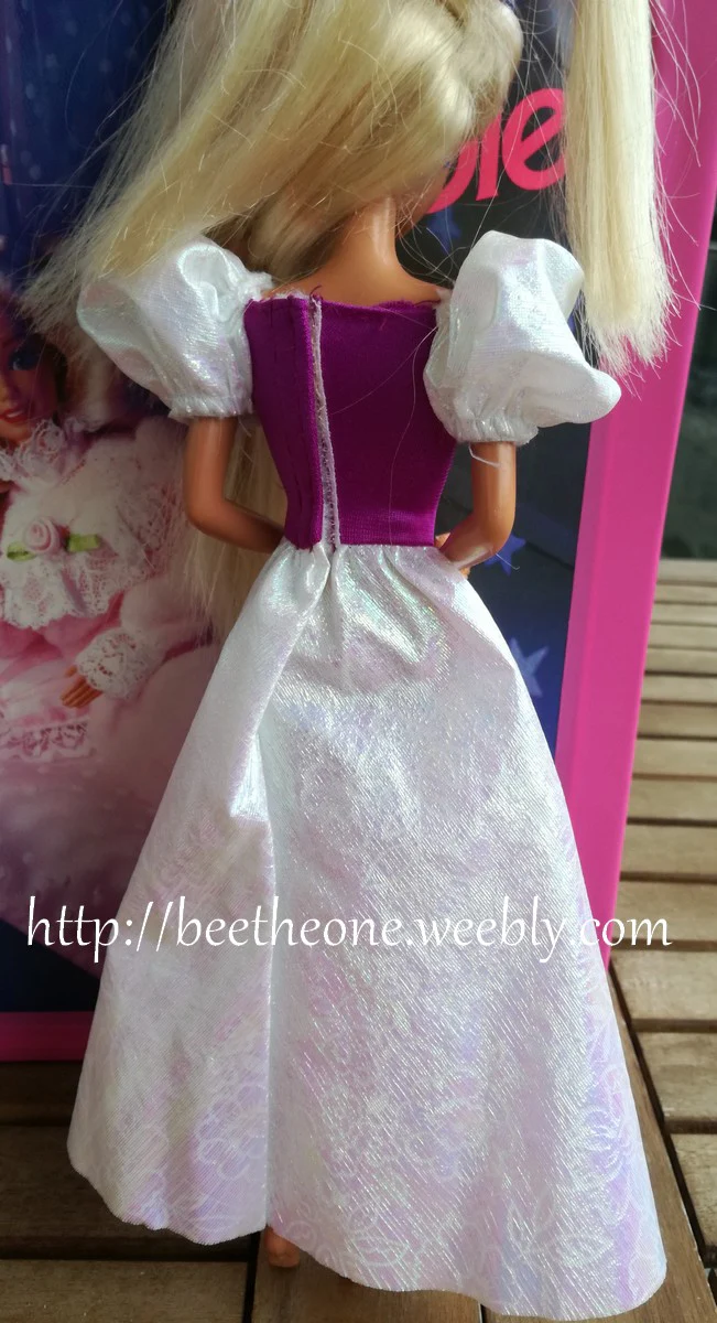La robe de cette poupée présente deux variantes: celle avec le bustier violet a été vendue exclusivement aux USA tandis qu’en Europe la robe a un bustier rose