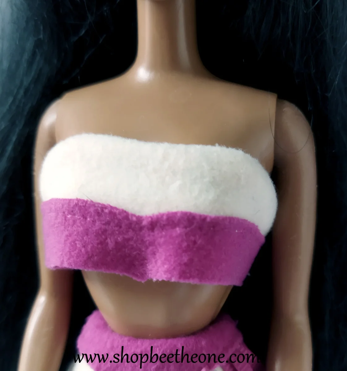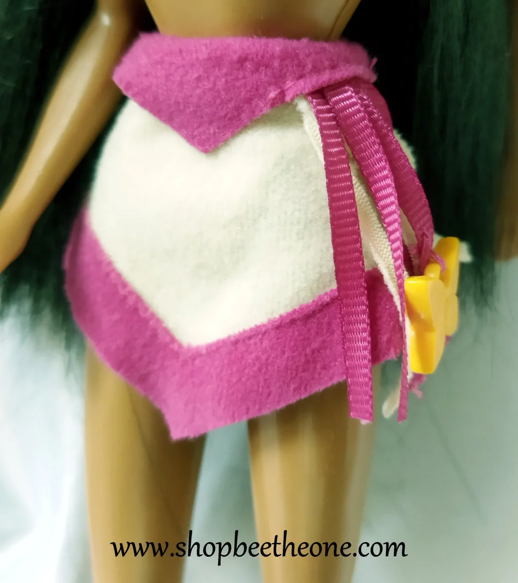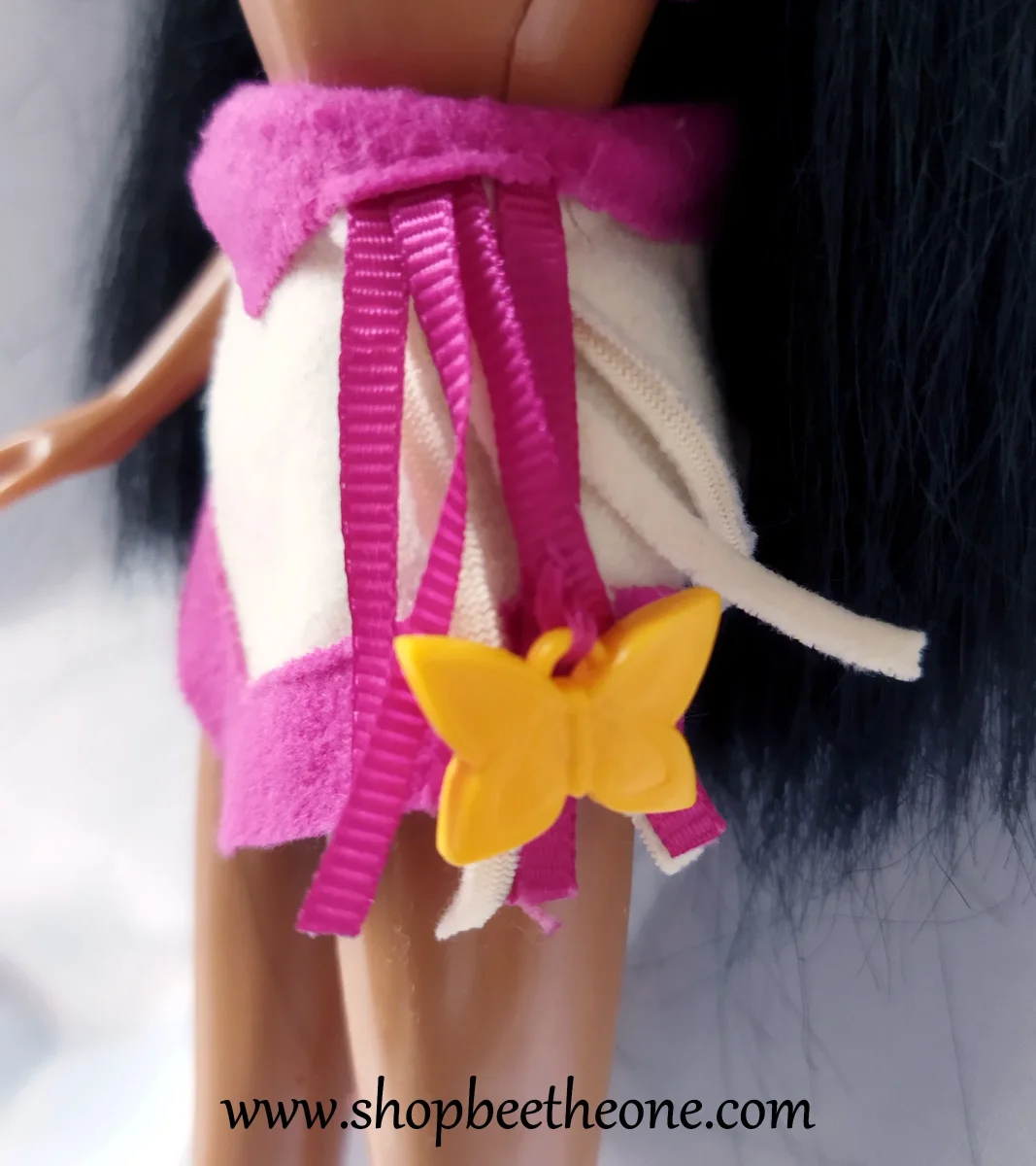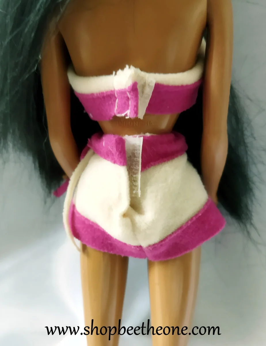 La tenue est propre et en très bon état. Le haut a perdu ses bretelles transparentes, qui se sont décomposées avec le temps, il n’en reste rien. Il manque une des deux breloques papillon à la jupe