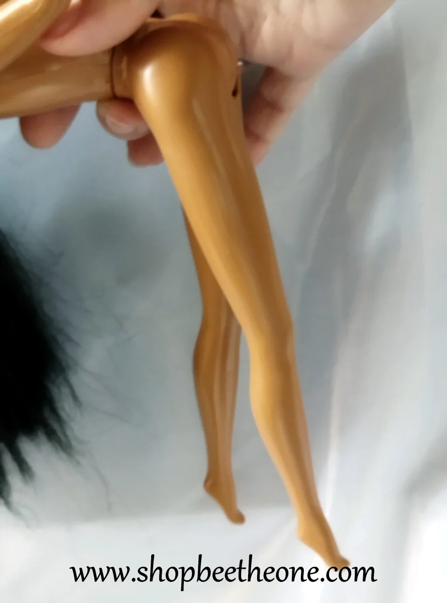 La poupée est en très bon état général et propre mais elle présente des signes d’usure. Le visage a notamment quelques petites traces noires peu visibles autour des yeux. Il est possible que ce soit un défaut de fabrication, je ne le sais pas. Elle a aussi quelques taches légèrement décolorées sur le buste mais ça ne se voit que sous un certain angle. Ses jambes ont perdu beaucoup de leur rigidité d’origine, de sorte qu’elles font comme un « balancier » quand on prend la poupée dans la main par la taille. Mais cela n’empêche pas de jouer avec la poupée ni de l’exposer.