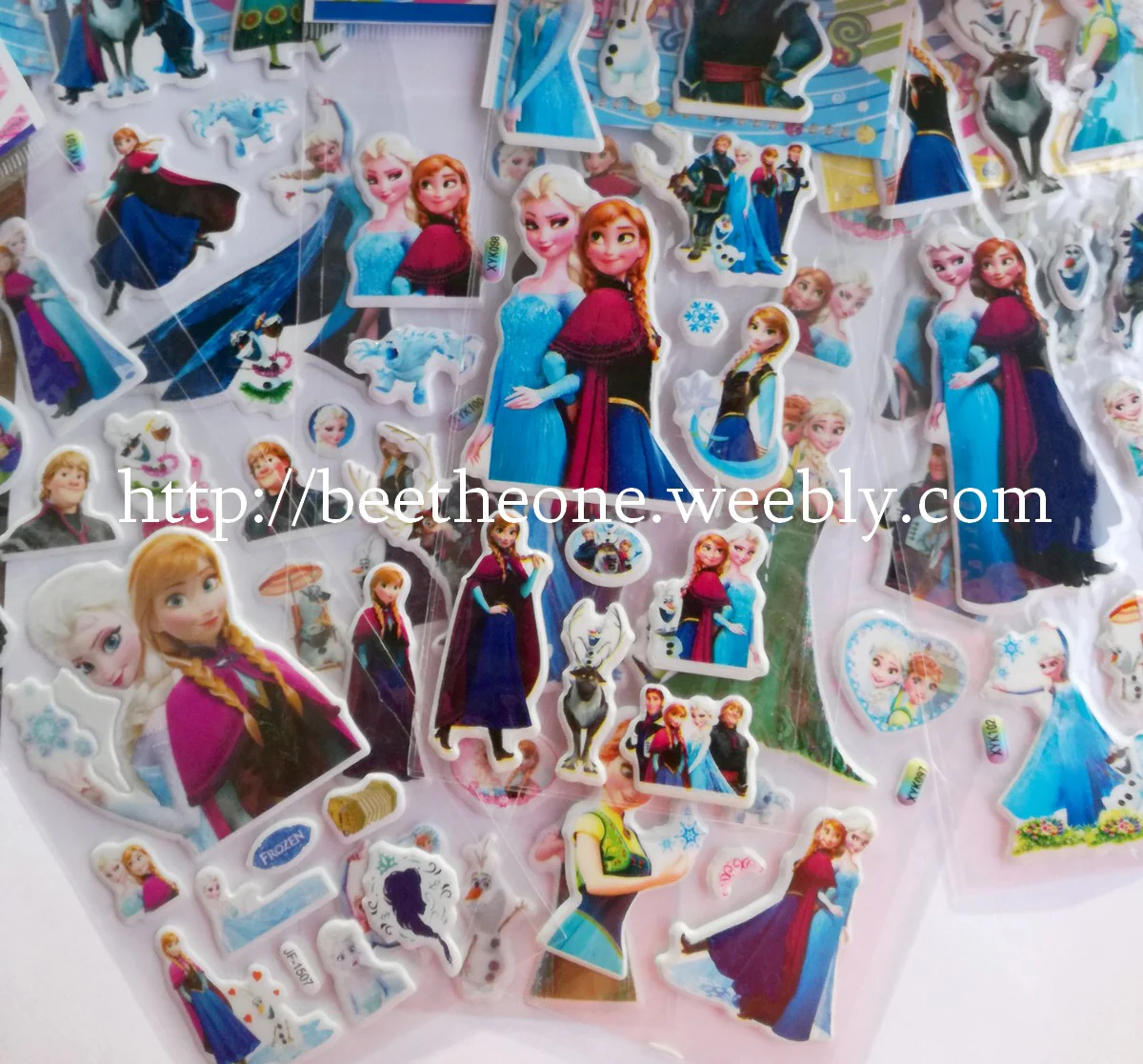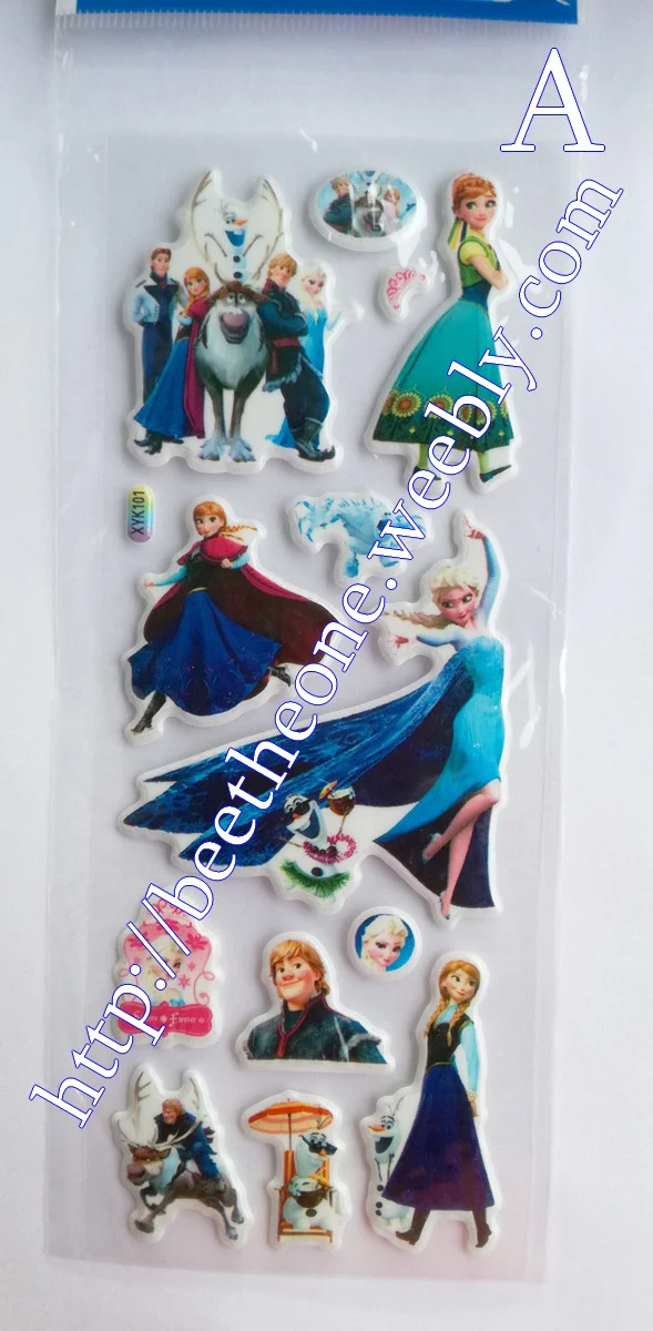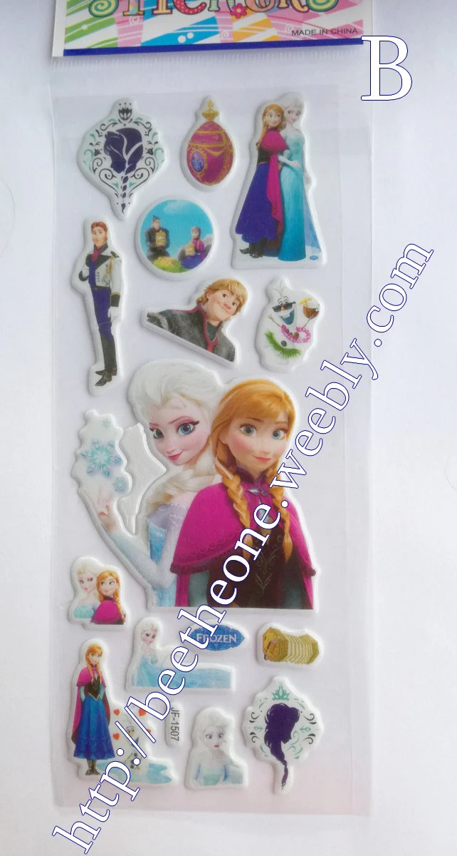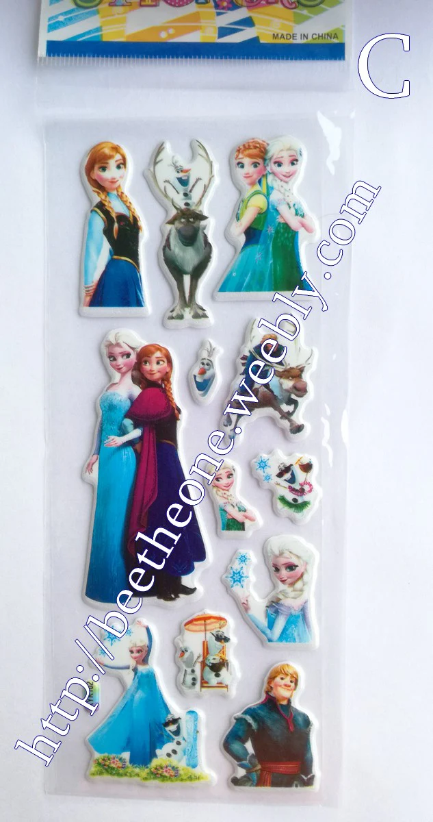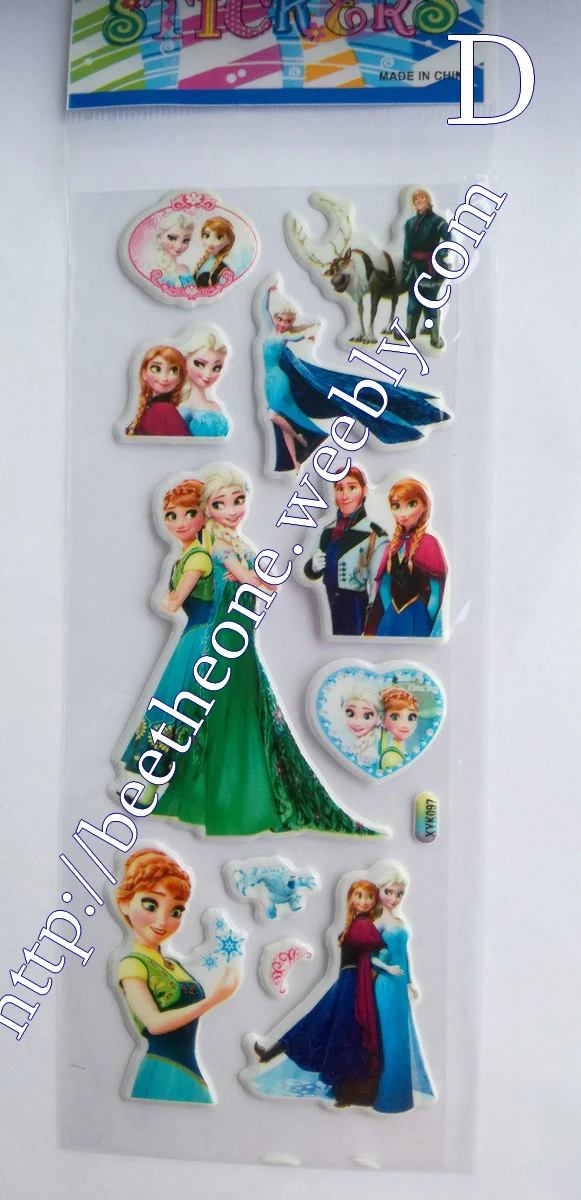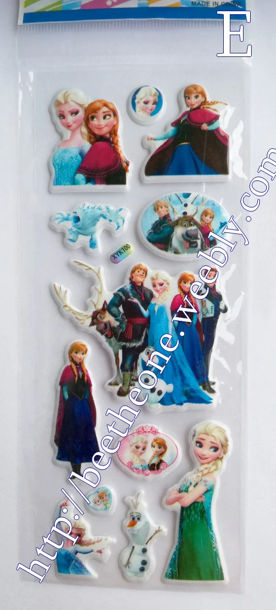 Cinq modèles différents de planches de stickers autocollants en relief avec les personnages de la Reine des Neiges, dans leur version du film mixée avec leur version du court-métrage Une Fête Givrée
