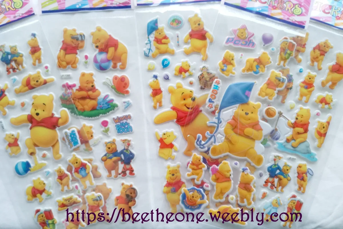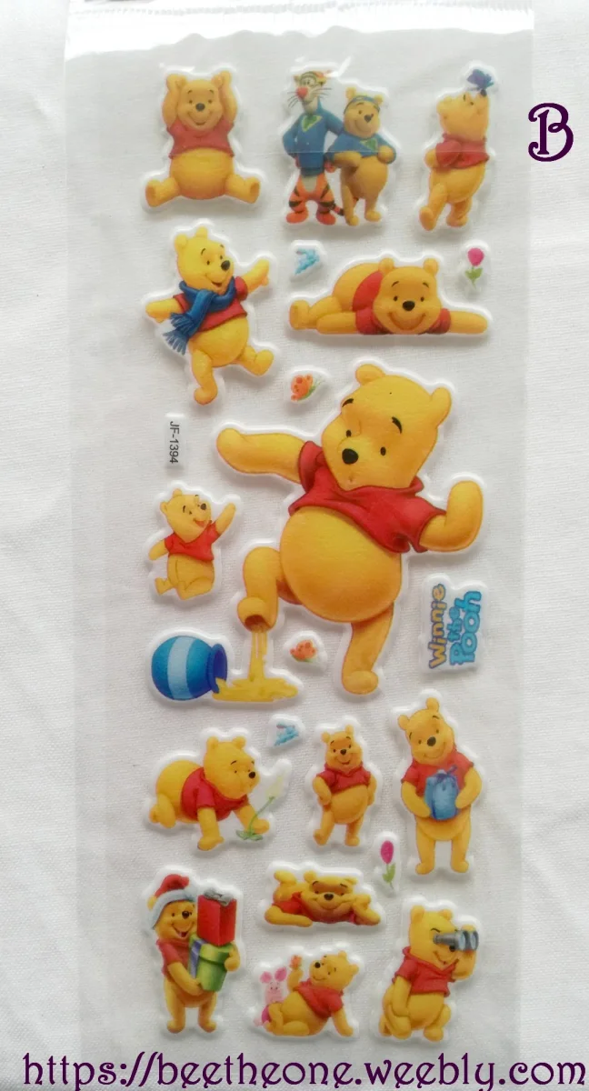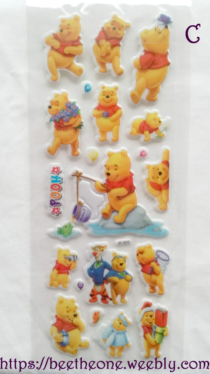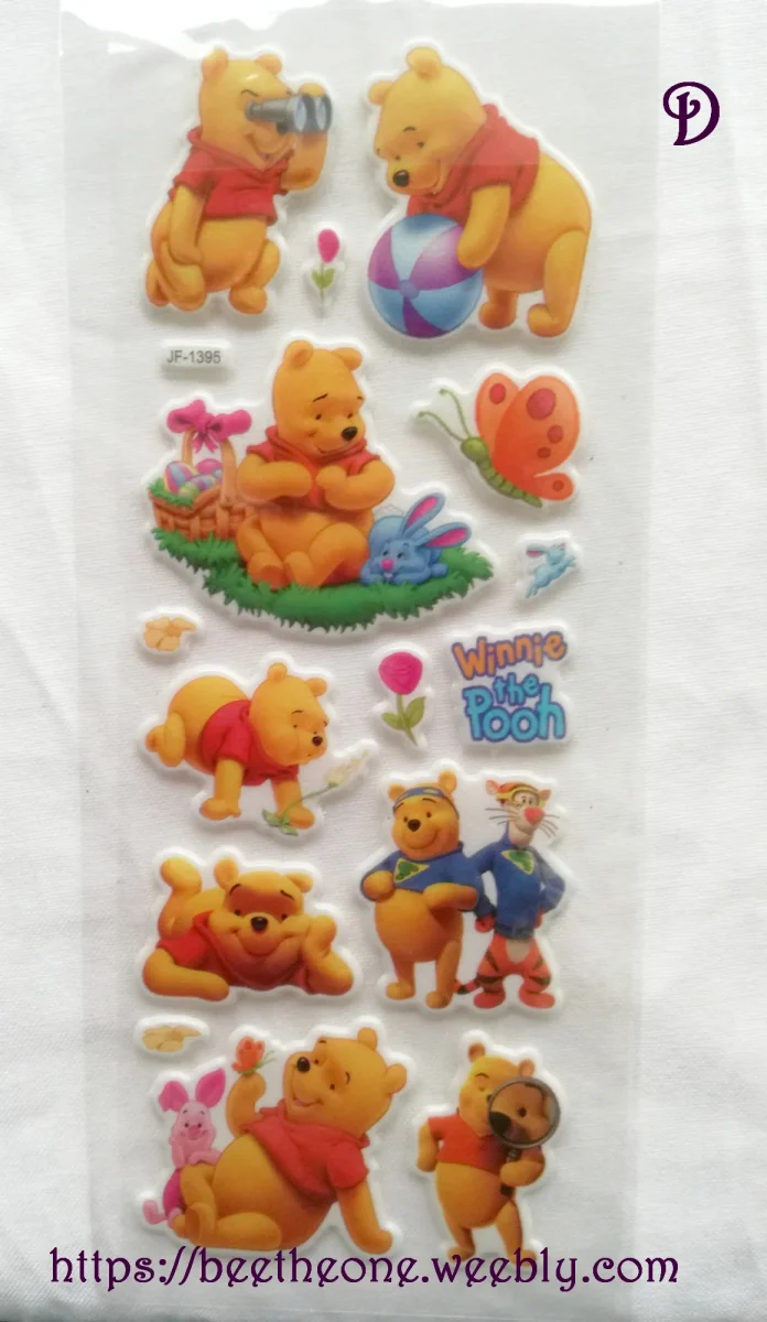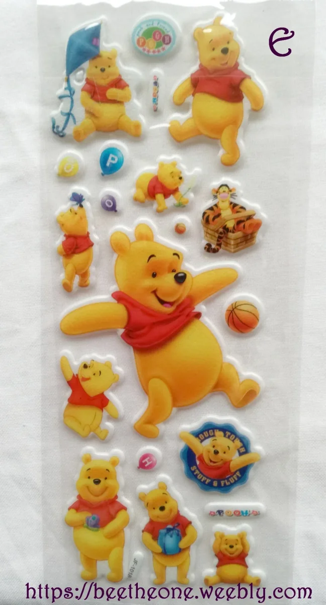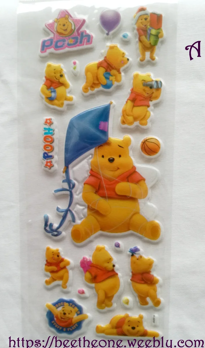 Cinq modèles différents de planches de stickers autocollants en relief avec Winnie l’Ourson et ses amis