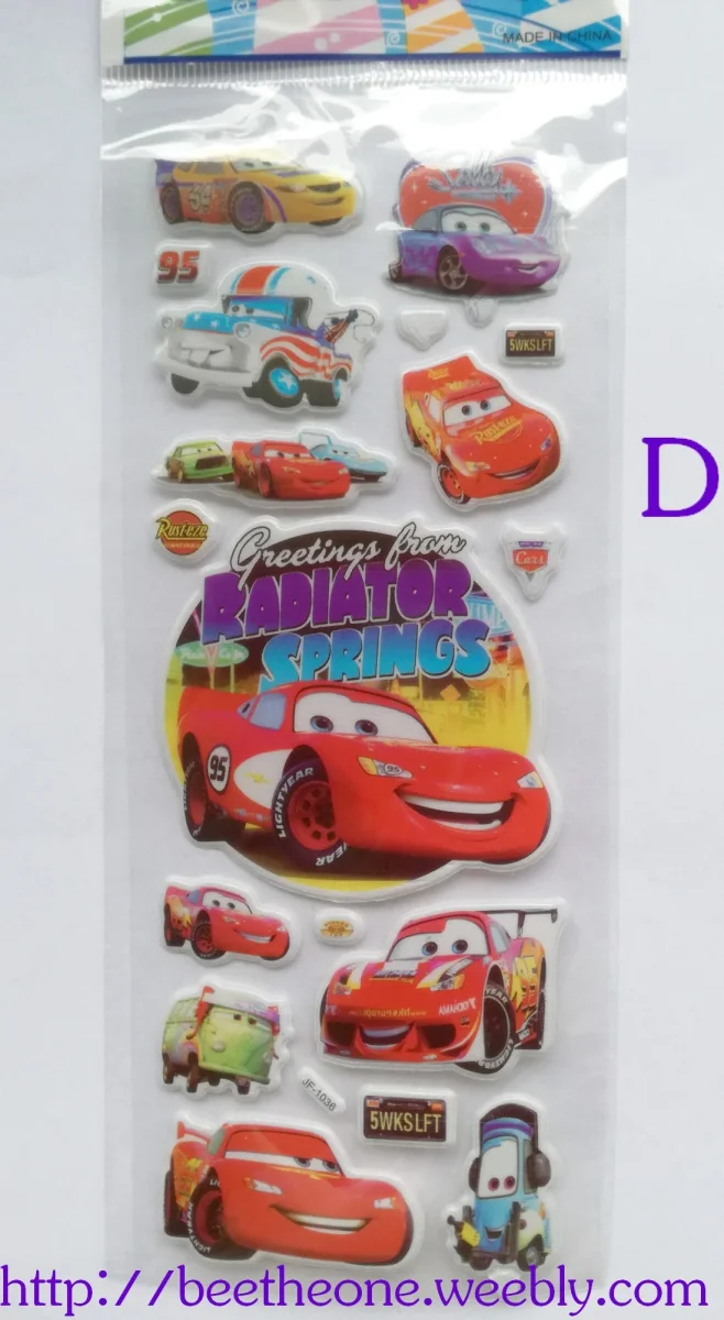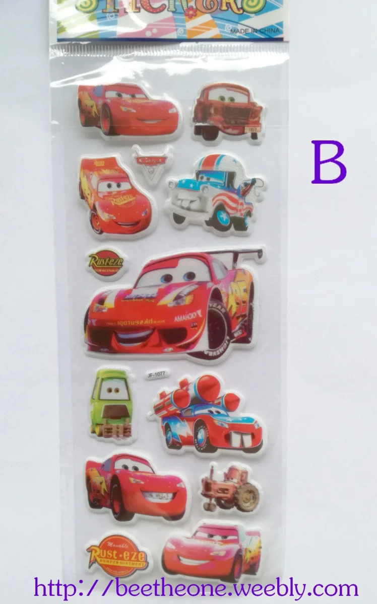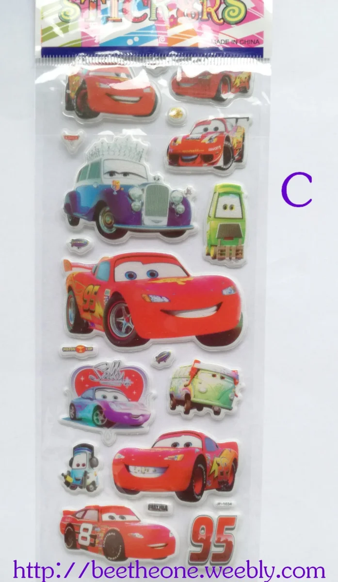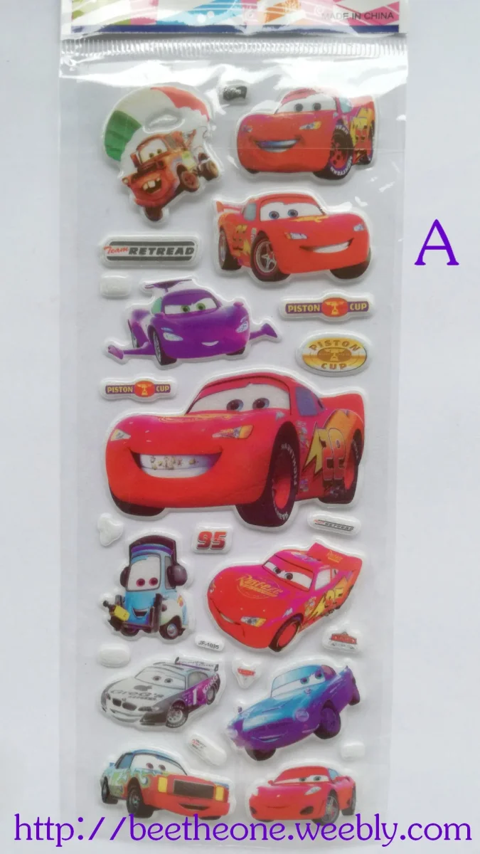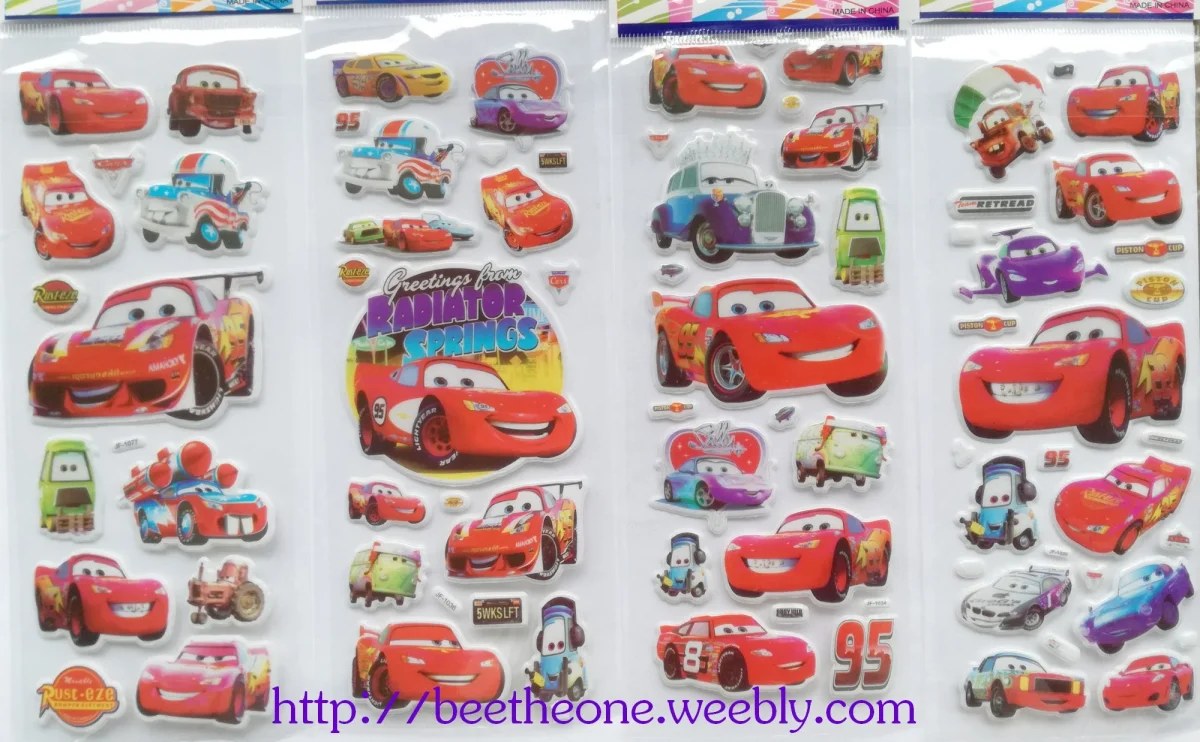 Différents modèles de planches de stickers autocollants en relief avec des personnages de voitures